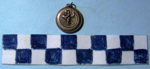 Di forma circolare. Sul recto, al centro, in rilievo, entro tondo una figura allegorica femminile rappresentante la Vittoria alata nell'atto di scrivere sullo scudo. Sul verso, iscrizione in rilievo al centro entro corona d'alloro