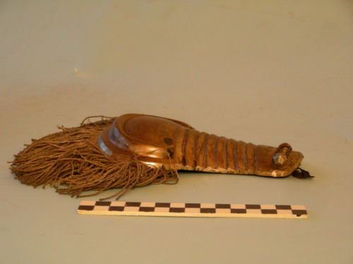 Di metallo dorato, di forma arrotondata, con due bottoni decorati ad incisione ed alamaro, 8 scanalature nella parte centrale e bordo con 1 rilievo semiellittico. Frangia di canottiglia dorata applicata al bordo inferiore. Sulla parte posteriore, vite di fissaggio, gancio metallico, imbottitura trattenuta da fascia dorata, due frammenti di legno trattenuti da anelli di fissaggio.