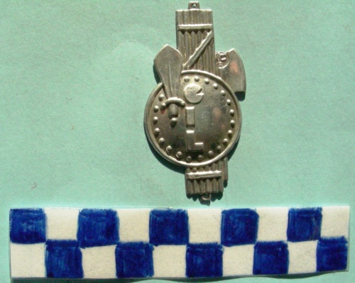 Scudo con borchie lungo la corona, una daga rivolta verso l'alto, sporgente oltre lo scudo sul lato sinistro, al centro iscrizione verticaledall'alto verso il basso, il tutto sovrapposto ad un fascio littorio. Due occhielli di fissaggio sui lati corti del fascio littorio.