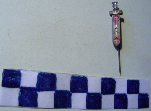 A forma di gladio rivolto verso il basso. Impugnatura a forma di testa d'aquila rivoltata. Iscrizioni sull'elsa e sulla lama tra le due croci greca e di Lorena di colore rosso. Sul verso, spilla di fissaggio.