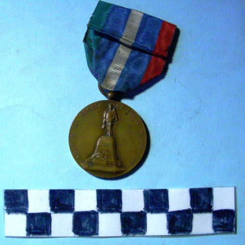 Di forma circolare. Sul recto, al centro, in rilievo un monumento di Umberto I in piedi e grande uniforme. Ai piedi del basamento un'aquila abbassata, in volo a sinistra. Iscrizioni lungo la corona e sul basamento. Sul verso al centro, in rilievo scudo sabaudo coronato sovrastante cartiglio con iscrizione e rami di quercia e d'alloro. Ulteriore iscrizione lungo la corona. Anello all'appiccagnolo. Nastrino di cinque strisce, verde, azzurro, bianco, azzurro e rosso.