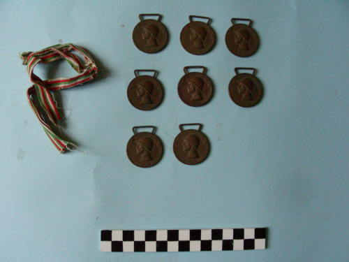 serie di otto medaglie uguali, tenute insieme da un unico nastrino. Disco leggermente incavato recante sul diritto il volto di Vittorio Emanuele III rivolto verso sinistra con l'elmo e la divisa, attorniato da iscrizione alternata a rami d'alloro intrecciati. Sul retro si trova la figura allegorica della libertà con le ali spiegate, sopra a due soldati elmati che reggono degli scudi. Il nastro è composto dal tricolore italiano invertito (strisce verdi, bianche e rosse), ripetuto per sei volte. Esso riprende volutamente il tema a fasce del nastro della medaglia per le Guerre d'Indipendenza a significare il definitivo completamento dell'unità nazionale con la Prima Guerra Mondiale.