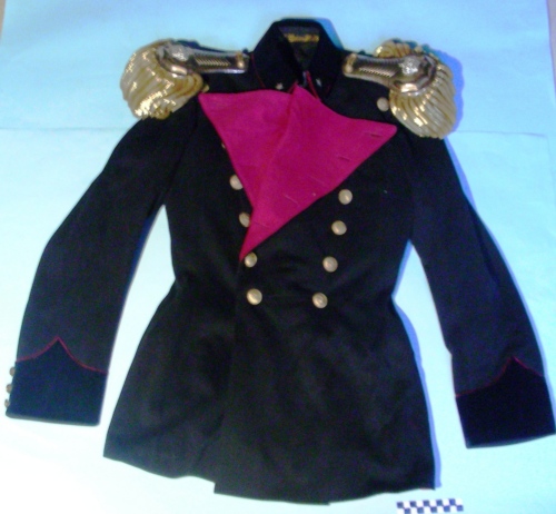 A doppio petto di lana nera con colletto, decorato da due stellette a cinque punte e paramani in velluto nero profilati in porpora. L'interno delle falde pettorali è rivestito di panno color porpora. Sulla parte anteriore due serie di bottoni dorati e bombati con distintivo del corpo ed iscrizione. Nella parte posteriore finta abbottonatura con quattro bottoni dorati e bombati con distintivo del corpo ed iscrizione. Tre ulteriori bottoni di dimensione minore per manica decorano i paramani. All'interno fodera nera e bianca, spigata per le maniche ed imbottitura ed etichetta. All'interno dei pettorali sono stati ricavati due taschini in posizione verticale. Sul colletto sono stati applicati due ganci di chiusura. Un ulteriore bottone argentato e piatto è cucito nella parte interna. Sulle spalle sono state applicate due controspalline di metallo dorato di forma arrotondata con due bottoni decorati in rilievo ed alamaro, dieci scanalature nella parte centrale e un rilievo a sette lati semi-ellittici segmentati. All'interno sono state applicate due corone Savoia di colore argento. Frange in canottiglia dorata applicate al bordo.