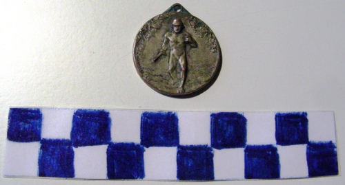 Di forma circolare. Sul recto, al centro, in rilievo, di fronte una figura maschile che avanza nuda e con elmo ed un pugnale sguainato nella mano destra. Rami d'alloro e di quercia lungo la parte superiore della corona. Iscrizione sulla sinistra della figura. Sul verso, tra rami, d'alloro un pugnale in posizione verticale che spunta da un cartiglio. Iscrizione sovrastante.