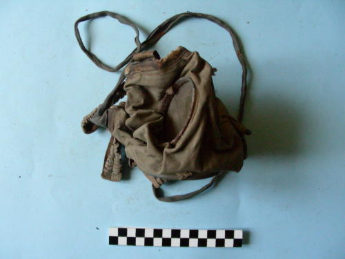 Facciale con due lenti circolari contornate da lamierina metallica, sei lacci di fissaggio alla nuca cuciti al bordo e raccordati. Alloggiamento per il filtro con foro filettato alla base.
