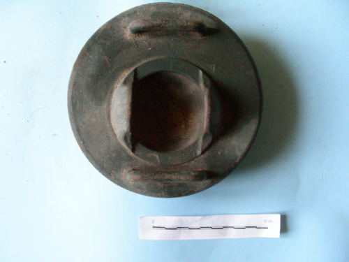 Di forma circolare con due magliette poste ai lati di un incavo con due alette sporgenti verso l'alto, in funzione di alloggiamento per il mortaio. Tre ramponi di fissaggio, di cui uno di altezza inferiore, e sporgenza semisferica al centro della parte inferiore della base. Verniciatura colr grigio-verde.