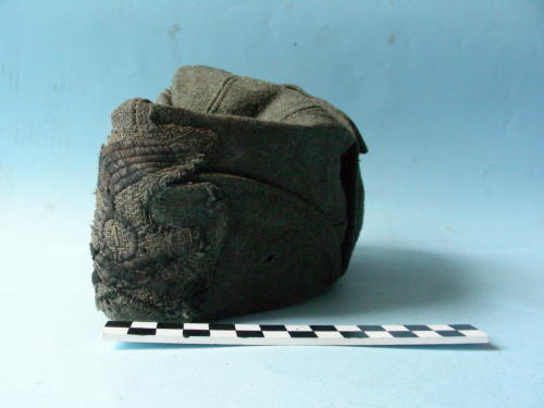 Floscia, con visiera ripiegata sulla fronte e paraorecchi fissati con due bottoni sulla sommità. Colore girigio-verde militare. Foderata all'interno.