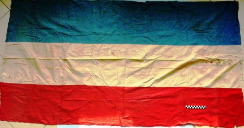 Di forma rettangolare con le fascie di colore blu, bianco e rosso a sviluppo orizzontale.
