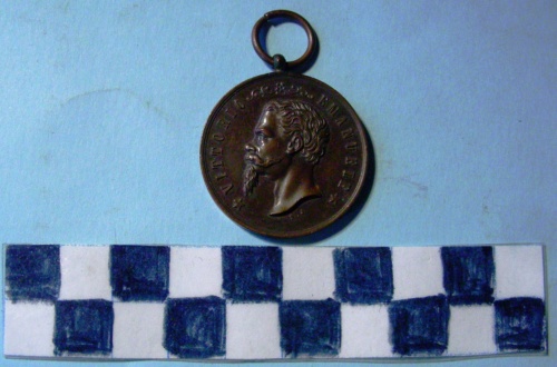 Di forma circolare. Sul recto, al centro, in rilievo busto accollato a sinistra di Vittorio Emanuele II. Iscrizioni sotto la figura e lungo la corona tra due stelle a cinque punte e fregio. Sul verso iscrizione al centro. Anello all'appiccagnolo.
