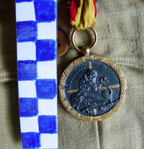 Disco brunito inciso con corona esterna dorata e decorata a motivi floreali, recante sul diritto quattro daghe dorate a 90 gradi con impugnatura verso il centro sormontate da un leone con la coda dritta che calpesta una figura mitologica alata con coda di serpente recante una falce e martello sull'ala. Sul retro 2/3 della corona dorata con iscrizione, un'aquila con ala spiegata e testa rivolte a destra, l'aquila stringe lo scudo reale della Spagna, sulla destra della medaglie un fascio di cinque frecce con giogo, nella parte inferiore un elmo. Il nastro è composto da due strisce rosse e da una striscia gialla al centro.