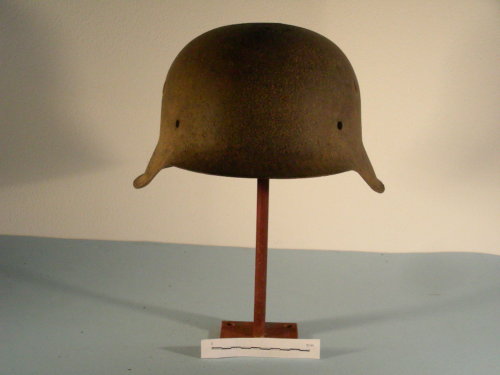 Calotta estroflessa con due fori di aerazione e tre fori per i rivetti di fissaggio del cerchio che sosteneva l'imbottitura interna. Visiera pronunciata. Verniciatura di colore verde acceso.