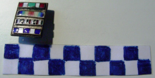 Lastrine di metallo saldate a comporre un rettangolo con una serie di 4 fori per lato per il fissaggio dei nastrini. Sul recto, sono fissate 4 barrette metalliche smaltate in colori diversi a rappresentare le diverse decorazioni. Dall'alto: 1) un nastrino blu con due bande bianche per croce al merito di guerra; 2) nastrino a bande rosse-bianche-verdi ripetute 4 volte con 2 stellette a cinque punte sulle bande bianche per volontario di guerra 15-18; 3)nastrino a bande blu-verdi-gialle-rosse ripetute una volta al contrario per medaglia commemorativa della vittoria 1918; 4) nastrino a bande rosse-bianche, ripetute una volta con al centro una banda verde. decorazione per l'unità d'Italia. Sul verso, è saldato un fermaglio a forma di goccia rovesciata.