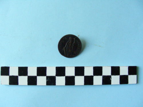 bottone metallico con occhiello sul retro e superficie superiore ornata da bordino a puntini. E' raffigurata la personificazione della Libertà (donna stante di fronte e volta a sinistra, che sostiene con la sinistra una picca sormontata da berretto frigio e poggia la destra su fascio littorio).