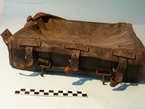Di forma rettangolare, affusto rigido ricoperto da tela, chiusura a ribalta con tre cinturini cuciti ed inseriti in passanti da fissare in tre fibbie cucite alla base. Due magliette con gancio cucite alla base per accogliere gli spallacci cuciti sul dorso. Sotto la ribalta due patte di chiusura contrapposte con due cinturini sul lato destro e due fibbie sul lato sinistro. All'interno della ribalta è stata ricavata una tasca con chiusura a legaccio a otto fori.