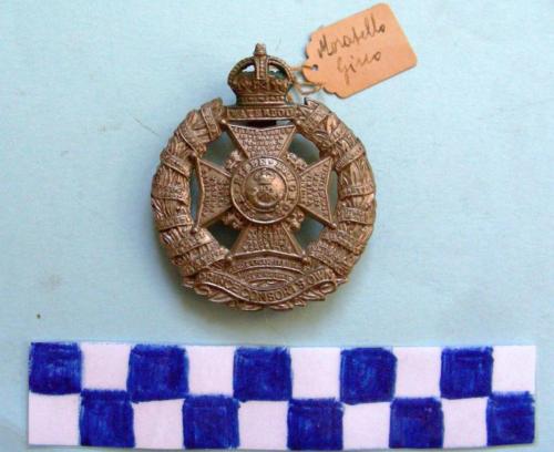 Croce patente con bomba al centro contenenteun corno ed una corona circondate da iscrizione. Iscrizioni sui bracci. La croce è circoscritta da due fasci d'alloro stretti da un nastro e sormontati da corona. Iscrizione suo nastri ed alla base. Sul retro spilla di fissaggio.