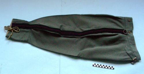 In cordellino grigio-verde alla cavallerizza con bande laterali di panno nero e filetto rosso scuro, due tasche ai fianchi ed una posteriore a destra chiuse da bottoni, un taschino alla cintura a sinistra. Patta con chiusura a 5 bottoni ed ulteriori 5 bottoni di diametro maggiore in cintura. Campanella di forma semi-ellittica per sorreggere la sciabola cucita ad un passante in cintura a sinistra. Martingala per la regolazione del giro-vita cucita posteriormente. All'estremità dei pantaloni due fettucce di stoffa si stringono alla gamba per mantenere i pantaloni al'interno degli stivali.