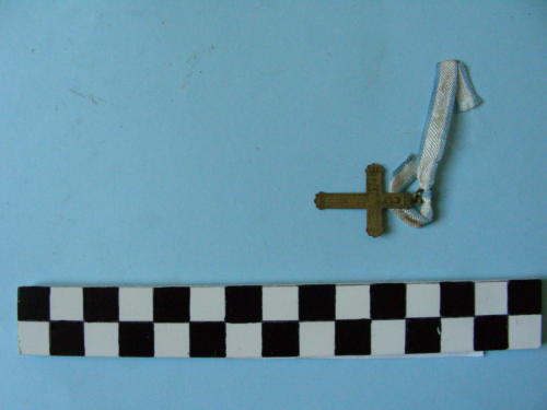 Croce con nastrino bianco con due bande laterali azzurre legato all'asola sulla sommità.