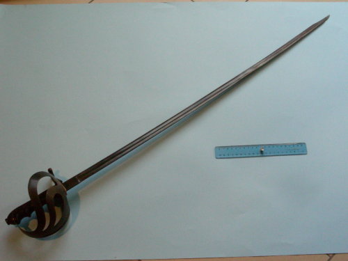Lama leggermente curva a filo, punta e controfilo; sgusciatura sui due lati per i primi tre quarti; per l'ultimo quarto doppio sguscio con punta ribassata alla pandura. Fornimento tipico con guardia e due elsi. Corto ramo di parata a riccio con conchiglia per il pollice. Cappetta lunga, arrotondata, con dorso zigrinato nell'ultimo quarto. Bottone piatto, ovale, avvitato al codolo. Impugnatura anatomica. Rivestimento al tallone.