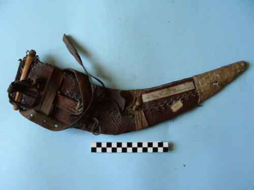 in cuoio non conciato, rigido, ricoperto in pelle (marocchino) decorata a motivi geometrici. Puntale ricoperto in pelle. Presente la cintura, la fibbia, due legni di chiusura del fodero e tre strisce annodate in pelle dalla metà all'imboccatura del fodero.