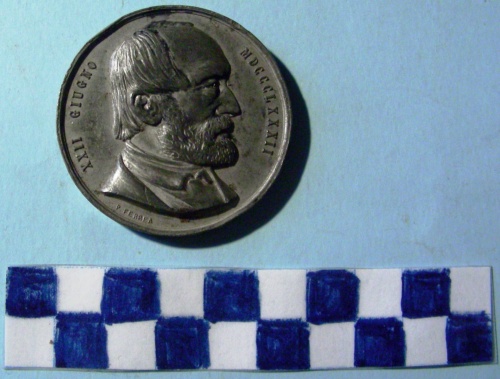 Di forma circolare. Sul recto, al centro, in rilievo, busto accollato a sinistra di Giuseppe Mazzini. Iscrizione lungo la corona e sotto il busto. Sul verso, al centro, in rilievo, figura allegorica femminile seduta a destra con in grembo un putto alato. A sinistra scudo sabaudo e in secondo piano una bandiera. Sullo sfondo monumento a Mazzini in Piazza Corvetto a Genova.