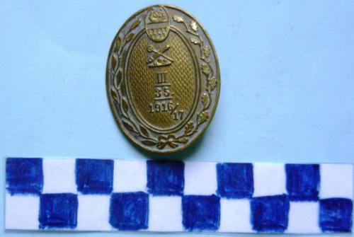 Di forma ovale. Ai lati due rami di quercia e alloro intrecciati. Nella parte superiore, un ovale diviso in tre parti, la prima con aquila ad ali spiegate, la seconda con parte zigrinata verticale, la terza con sette torri. Nell'ovale centrale, in rilievo, un cannone ed una palina di puntamento (?) incrociati ed iscrizioni. Sul verso spilla per il fissaggio.