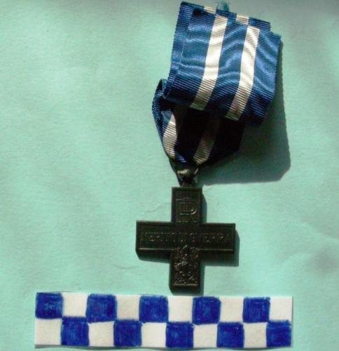 decorazione costituita da una croce greca riportante al diritto, sulle due braccia orizzontali, la scritta "MERITO DI GVERRA". Sulle braccia verticali si trova, in alto il monogramma della Repubblica Italiana. In basso si trova invece un gladio romano invaso di foglie d'alloro. Il retro raffigura in centro una stella a cinque punte raggiante sulle braccia della croce. Il nastro è azzurro con due strisce bianche centrali separate