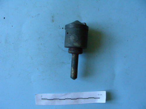 Corpo cilindrico, con tre fori e aletta forata sporgente; coperchio conico con due alette di avvitamento e vite in posizione inferiore con tubo sporgente.
