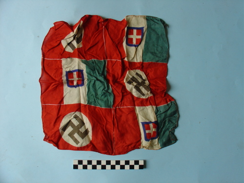 fazzoletto in tela stampata, con tre bandierine italiane (tricolore con al centro stemma sabaudo formato da croce bianca su scudo rosso contorniato in blu) e tre tedesche (rosse con al centro croce uncinata in nero su tondo bianco), posizionate alternate. Le sei bandierine sono divise da sottili stiriscie bianche, forse perchè in origine andavano ritagliate.