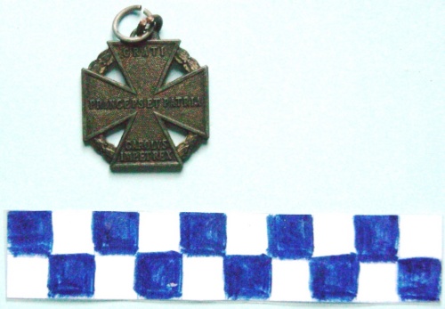 A forma di croce di San Giorgio su corona d'alloro con iscrizioni sui bracci, sul recto e sul verso.