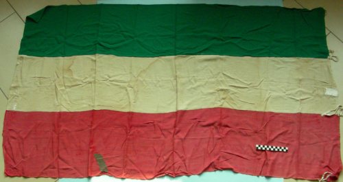 Tricolore a sviluppo orizzontale, con fascie cucite. Tre doppie fettucce per il fissaggio cucite su un lato corto.