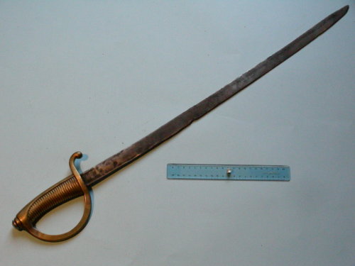 Lama curva, a un filo, punta al dorso con controfilo; liscia. Bottone semisferico avvitato al codolo. Impugnatura in unica fusione con la guardia e il ramo di parata, caratterizzata da 28 anelli di presa.