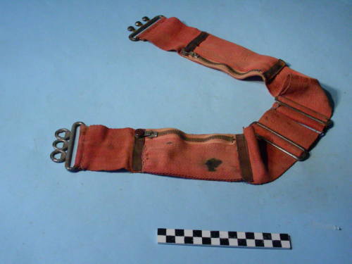 di colore rosso. Divisa in due parti unite da una maglietta sulla schiema. Chiusura con fibbia ad aggancio rapido composta di tre perni a semi-sfera concava da inserire in tre anelli della maglietta del lato sinistro. Due passanti per la regolazione della lunghezza inseriti alla schiena. Due tasche applicate ai lati, con profili di pelle ai lati e chiusura a cerniera lampo con tiretto chiuso con bottoni automatici.