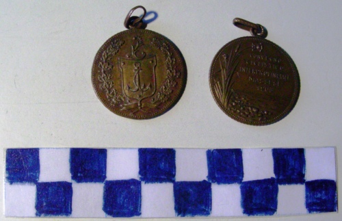 Di forma circolare. Sul recto, al centro, in rilievo, tra rami d'alloro legati da nastro, scudo inglese con ancora al centro, stemma di Massa Superiore. Sul verso, in rilievo, nella parte sinistra, una piantina fiorita su ninfee ed acqua al centro. Iscrizione sulla parte superiore. Anello all'appicagnolo.