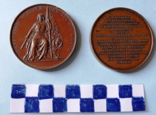 Di forma circolare. Sul recto, al centro, in rilievo figura allegorica femminile di fronte con una spada nella destra e l'asta di una bandiera nella sinistra, seduta sul trono; in secondo piano, a destra, il leone di San Marco. Iscrizioni lungo la corona ed in esergo. Sul verso, al centro, in rilievo iscrizione.
