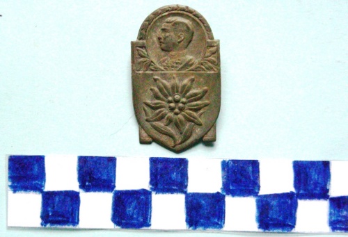 A forma di scudo. Al centro, in rilievo, una stella alpina con sovrastante tondo decorato a motivi floreali, con al centro in rilievo, rivolto a sinistra, il profilo di un ufficiale in alta uniforme. Sul verso, spilla di fissaggio.