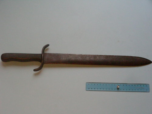 lama dritta molto spessa ad un filo. Punta al centro con controfilo. Guardia a crociera ad "S". Impugnatura dritta, a due guancette, ingrossata al centro e con nocca arrotondata