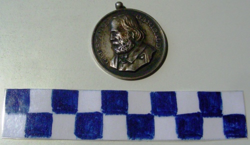 Di forma circolare. Sul recto, busto accollato a sinistra di Garibaldi. Iscrizione lungo la corona. Sul verso, iscrizione tra rami d'alloro e di quercia stretti da nastro
