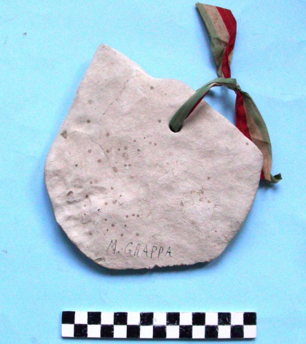Pietra di forma irregolare e piatta con nastro tricolore inserito in un foro.