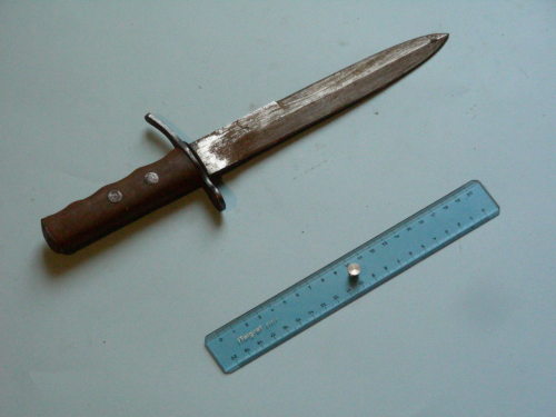 Lama dritta ad un filo e lungo controfilo. Punta simmetrica al centro. Il manico è composto da due guancette sagomate a quattro punti di presa, fissate da due spinotti e chiuse superiormente da una cappetta a rondella, ovalizzata; guardia a croce, leggermente curvo l'elso anteriore, di forma discoidale l'elso posteriore. Rivestimento al tallone.