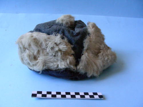 A calotta circolare con pon-pon sulla sommità; paraorecchie laterali terminanti con legaccio per il fissaggio superiore. Visiera ripiegata sulla fronte con applicata maschera facciale. Rivestimento interno in pelo su facciale, paraorecchie e visiera. Imbottitura interna sulla calotta.