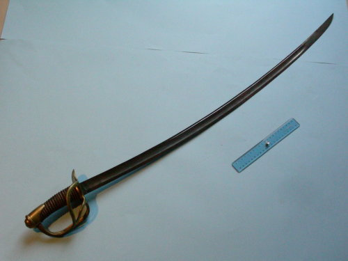 Lama curva; sguscio centrale fino al debole; rinforzo al dorso da un quarto della lama fino al debole. Punta al dorso. Guardia a tre elsi; cappetta stondata liscia. Codolo ribattuto su bottone ovale arrotondato. Impugnatura rivestita, sagomata a settori, con cordelline.