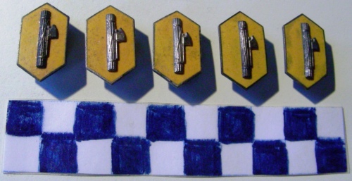 Di forma esagonale. Sul recto, al centro, in rilievo fascio littorio dorato a destra, in campo giallo. Sul verso, fermaglio di forma ovale ed iscrizione.
