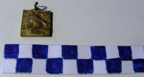 Di forma quadrata. Sul recto, al centro, in rilievo la figura di un marinaio seduto sulla murata di una nave. Sullo sfondo il mare. Iscrizione sulla murata Sul verso, nella parte inferiore, in rilievo un'ancora coronata con sovrapposto scudo sabaudo. In secondo piano tre navi da guerra stilizzate con i fumaioli fimanti. Iscrizione al centro.
