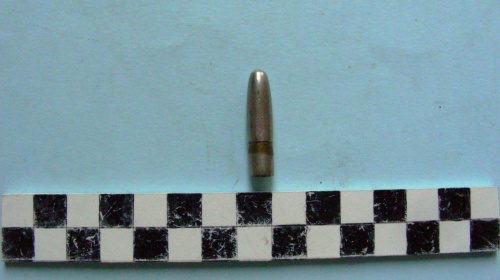 Di forma cilindrica, argentato, con ogiva conica arrotondata. anello di crampatura a circa un terzo. Base vuota.