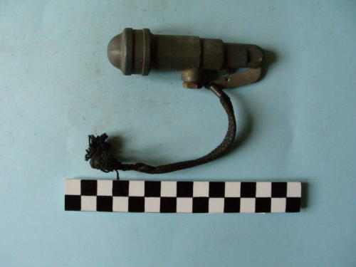 Di forma cilindrica, con testa arrotondata e corona sottostante; valvola in posizione mediana e leva di azionamento all'estremità, con cordino passante. Verniciatura di colore grigio-verde
