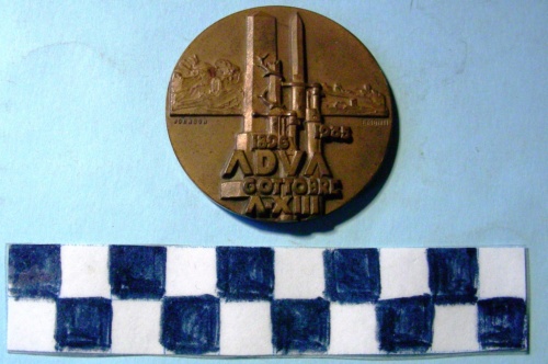 Di forma circolare. Sul recto, al centro, in rilievo due baionette inastate di cui una, spezzata avvolta da un roveto rampicante e posta sopra un obelisco. Sullo sfondo il profilo di una città africana. Iscrizioni a destra e a sinistra sotto il paesaggio. Ulteriore iscrizione nella parte inferiore. Sul verso, al centro, in rilievo a destra un fascio littorio di moschetti con baionette inastate. In secondo piano una croce copta a forma di rosone e la parte superiore dell'obelisco di Axum. Iscrizioni sotto la figura e a destra lungo la corona.