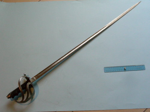 Lama dritta a filo, punta e controfilo; sgusciature sui due lati per i primi tre quarti, per l'ultimo quarto a sezione romboidale; incisa ad acido per tre quarti a motivi militari e floreali. Punta al centro. Fornimento tipico con guardia e due elsi. Corto ramo di parata a riccio con conchiglia per il pollice. Cappetta lunga, arrotondata, con dorso zigrinato nell'ultimo quarto. Bottone piatto, ovale, avvitato al codolo. Impugnatura anatomica.