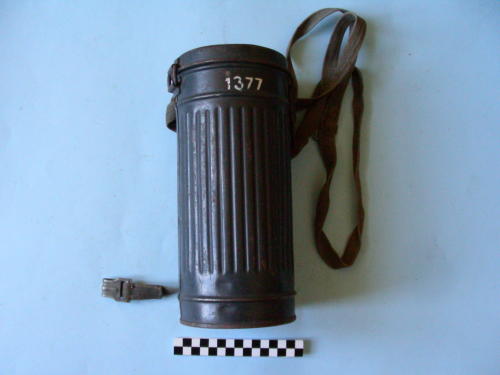 Di forma cilindrica, con scanalature verticali; coperchio con chiusura a gancio a molla azionabile tramite fettuccia. Tre magliette di fissaggio della tracolla, presente e regolabile; le due magliette superiori sono in posizione diagonale. Verniciatura color verde scuro. All'interno del coperchio è presente un contenitore quadrato, con angoli arrotondati, sportellino a pressione e molla all'interno che ferma quattro ricambi per oculari della maschera, chiusi in quattro bustine; i due oculari dentro ogni bustina sono separati da un cartone di forma circolare. Panno all'interno del cilindro, alla base.