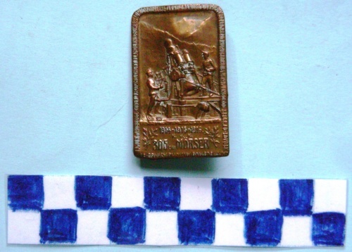 A forma di rettangolo. Al centro, in rilievo, grosso mortaio puntato verso l'alto con due serventi ai lati. Iscrizioni lungo tutti i lati e in un rettangolo sotto la figura. Sul verso, spilla di fissaggio ed ulteriore iscrizione.