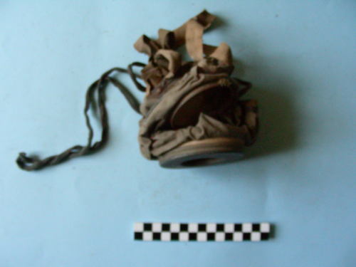 Facciale con due lenti circolari contornate da lamierina metallica e sei lacci di fissaggio alla nuca cuciti al bordo e raccordate sulla nuca, e la tracolla. Alloggiamento per il filtro con foro filettato alla base.